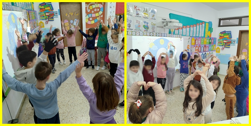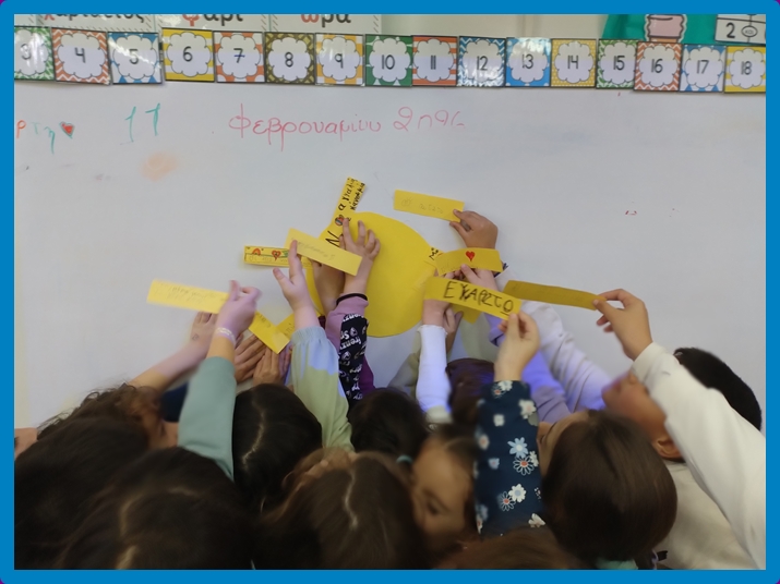 Μιλήσαμε αρχικά για τον Ήλιο! Τον τρόπο που μας βοηθάει να μετράμε τον χρόνο, τα στάδια της μέρας, τις δραστηριότητες που συνδέονται με αυτά αλλα και τι μας προσφέρει ο ήλιος στη ζωή μας. Μάθαμε να προσανατολιζόμαστε δείχνοντας την Ανατολή και τη Δύση με τα χέρια μας και το Βορρά και τον Νότο με το σώμα μας!