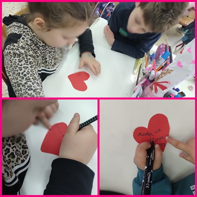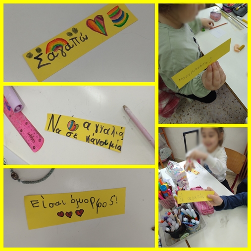 Ζωγραφίσαμε καρδιές αγάπης και κόψαμε ένα σύνθημα στα αγγλικά : Be strong, our friends! Το συζητήσαμε και εστιάσαμε στη δύναμη και την στήριξη που χρειάζονται τα παιδιά που ασθενούν.