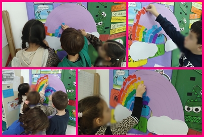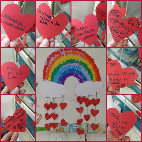 Συνεχίζοντας τις δραστηριότητες από το project των Καιρικών Συνθηκών - Συναισθημάτων μας και με έμπνευση λίγη από την αγάπη του Αγίου Βαλεντίνου (που πέρασε το προηγούμενο Σαββατοκύριακο), φτιάξαμε ένα ομαδικό ουράνιο τόξο γεμάτο καρδουλένιες ευχές! Θυμηθήκαμε ότι το ουράνιο τόξο μας κάνει να νιώθουμε ελπίδα και πάντα να ευχόμαστε για κάτι καλύτερο! Κι εκεί ήρθαμε σε μας...Τι ευχη θα κάναμε για εμάς και την τάξη μας; Πώς μπορούμε να γίνουμε καλύτεροι; Ξεκινήσαμε τις ευχές μας με το "Μακάρι..." και η κάθε απάντηση έκρυβε και μια επιθυμία για την ομάδα μας! Δεν έχει σημασία αν έχουμε μικρολαθάκια, σημασία έχει να τολμάμε να γράφουμε αυτό που θέλουμε να εκφράσουμε και να αγαπήσουμε τον γραπτό λόγο! Όσο η ολομέλεια έγραφε, κάθε ομαδα σηκώνονταν με τη σειρά και έφτιαχνε με τεχνική ψηφιδωτού κολάζ το κομμάτι της στο ουράνιο τόξο. Όλοι βάζουμε το δικό μας κομμάτάκι... για ένα όμορφο αποτέλεσμα! Κυριολεκτικά και μεταφορικά!