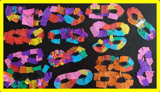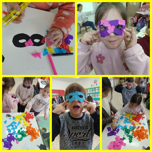 Η Παρασκευή πάντα μας δίνει περισσότερο χρόνο για παραπάνω κατασκευές! Η κατασκευή αυτής της εβδομάδας ήταν...τι άλλο; Μια πολύχρωμη μάσκα! Την κόψαμε και την διακοσμήσαμε με κομματάτια γκοφρε χαρτιού! Ήταν ευκαιρία να ξαναμιλήσουμε και για τα μοτίβα!