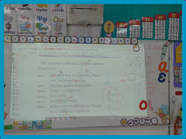 Στη Γλώσσα της εβδομάδας μάθαμε το τελευταίο /ι/, το οι. Μιλήσαμε για τον πληθυντικό των αρσενικών ουσιαστικών σε -ος και για τις ερωτηματικές λέξεις Ποιος,Ποια,Ποιο. Κάναμε όλοι προφορικές ερωτήσεις στην τάξη.