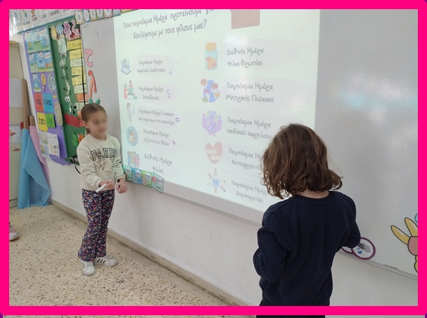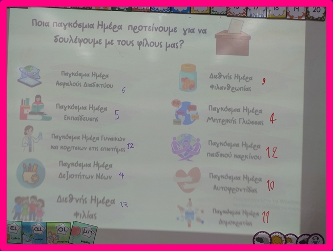 Την Παρασκευή κάναμε ψήφισμα για την δραστηριότητα του Sustain Well, του eTwinning έργου μας. Μαζί με την κ. Ελένη τα παιδιά διέτρεξαν το Ημερολόγιο που είχαμε φτιάξει μαζί με τους συνεργάτες μας και εντόπισαν παγκόσμιες ημέρες που σχετίζονται με τους βιώσιμους στόχους ανάπτυξης 1,2,3,4,5,10,11,16. Στην συνέχεια το οπτικοποιήσαμε και αφού εξηγήσαμε κάποιες έννοιες ξανά, ψηφίσαμε τις θεματικές μέρες που θέλουμε να ασχοληθούμε. Καταγράψαμε ψήφους και καταλήξαμε σε 3 προτάσεις που θα στείλουμε στους συνεργάτες μας. Με αυτόν τον τρόπο τα παιδιά μαθαίνουν να αποφασίζουν όλα μαζί και να σχεδιάζουμε εργασίες για θέματα που τους ενδιαφέρουν!