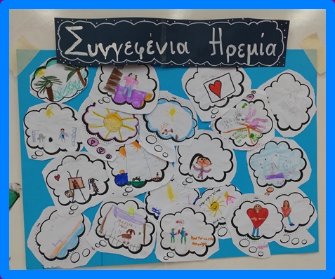 Στη συνέχεια ανοίξαμε συζήτηση για το συναίσθημα που μας προκαλεί η συννεφιά. Το σύννεφο το συνδέσαμε με την ηρεμία και την σκεπτική διάθεση. Τι μας κάνει όμως να ηρεμούμε; Τι σκεφτόμαστε όταν νιώθουμε αγχωμένοι και αναστατωμένοι; Καταγράψαμε τις απαντήσεις μας σε συννεφάκια με ζωγραφιές! Όλες είναι μία και μία και κάτι έχουν να μας πουν!!!