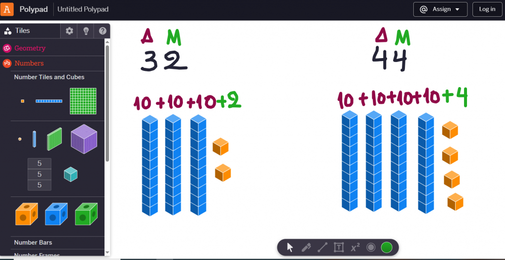 Αρχίσαμε να χτίζουμε αριθμούς με τουβλάκια (πυργάκια των 10 και μονά τουβλάκια). Μπορείτε να το κάνετε και στο σπίτι χρησιμοποιώντας το εργαλείο Mathigon Polypad από εδώ και από την πλαϊνή μπάρα. Έτσι συζητησαμε ότι είναι πιο εύκολο και πιο γρήγορο να υπολογίζουμε αυτούς τους μεγάλους αριθμούς.