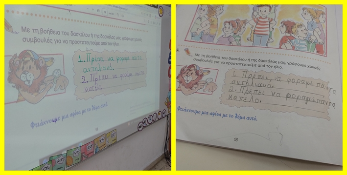 Αφού ήδη είχαμε δει το σχετικό βίντεο για την παράδοση με τα μαρτάκια και τα χελιδονίσματα την Παρασκευή, μάθαμε ότι σύμφωνα με την παράδοση το βραχιολάκι του Μάρτη μας...προστατεύει από τον ήλιο! Για να μην μας κάψει ο ήλιος, λένε! Είναι πράγματι έτσι;;; Είναι η τέλεια ευκαιρία για να συνεχίσουμε στο επόμενο μάθημα της Μελέτης μας που αφορά την προστασία μας από τον ήλιο! Η Καμηλώ η καμηλοπάρδαλη και ο Λέων το λιοντάρι μας τα εξήγησαν αναλυτικά! Στο τέλος γράψαμε και αντίστοιχες τις συμβουλές μας στο τετράδιο εργασιών της Μελέτης μας.