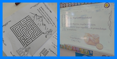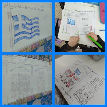 Συνεχίσαμε με επετειακή θεματολογία! Πέρα από το ποίημα του Εθνικού Ύμνου και κάποιους στίχους από τον Θούριο είδαμε μέσα από ένα βιβλιαράκι τι γιορτάζουμε στη διπλή γιορτή. Θυμηθήκαμε πώς χρωματίζουμε σωστά τη σημαία μας και το συμβολίζει. Μιλήσαμε για τους ήρωες του 1821, το κρυφό σχολειό, τον Ευαγγελισμό και τον παραδοσιακό μπακαλιάρο!
