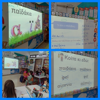 Στη Γλώσσα εξάσκηθηκαμε λίγο ακόμα στην απόστροφο με κουίζ, αλλά μάθαμε και τα διαλυτικά! Σαν κανόνα τον είχαμε ξανασυναντήσει άτυπα μέσα σε κάποιο ποίημα και σαν ιδέα ήταν κάτι που μας ήταν οικεία. Αυτό που χρειάστηκε χρόνος για να το εμπεδώσουμε είναι ότι όταν τονίζεται το μπροστά γραμματάκι η λέξη δεν παίρνει διαλυτικά (άι,όι).