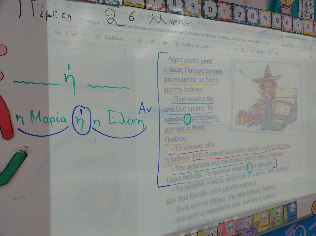 • Γλώσσα: ορθ,αναγν.προηγ., ΒΜ σελ. 35 και ΤΕ σελ. 35. Μιλήσαμε για τα ουσιαστικά ως προς τα γένη: αρσενικά-θηλυκά-ουδέτερα δίνοντας σημασία τόσο στα άρθρα όσο και στις καταλήξεις. Επίσης είπαμε για τα Κύρια Ονόματα (που παίρνουν κεφαλαίο). Υπογραμμίσαμε με διαφορετικά χρώματα τα λόγια του αφηγητή-θείου Πάυλου-Ιωάννας (μέχρι τη μέση). Είδαμε την απόστροφο και την Αλφαβητική σειρά. Δόθηκε σελιδοδείκτης με την ΑΒ σε τρενάκι για να βοηθηθούν με την Αλφαβητική σειρά. (Το κρατάτε σπίτι)