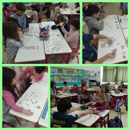 Την Παρασκευή παίξαμε "τράπεζα" με τους διπλανούς μας και έπειτα με τους απέναντι μας. Ο ένας ήταν ο ταμίας της τράπεζας και ο άλλος ήταν πελάτης που ήθελε να του "χαλάσουν" κάποια χρήματα. Έτσι μάθαμε να μιλάμε ευγενικά για το πλαίσιο της συναλλαγής, μάθαμε την μεταφορική έννοια του "χαλάω σε ψιλά" και χρησιμοποιήσαμε χαρτονομίσματα και νομίσματα του ευρώ για να φτιάξουμε το ποσό που θέλαμε κάθε φορά.