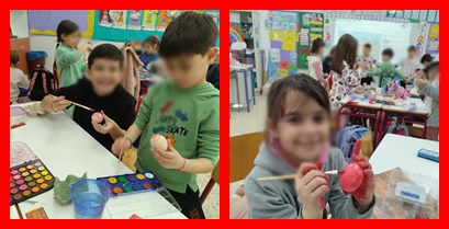 Η Πέμπτη ήταν μια μέρα εξίσου χαλαρή! Τις πρώτες ώρες δουλέψαμε στο πακετάκι του Πάσχα διαβάζοντας την Κυριακή των Βαΐων και το Μυστικό Δείπνο! Παράλληλα είδαμε βιντεάκια με τα κάλαντα του Λαζάρου και για τα ήθη και τα έθιμα του Πάσχα! Ακούσαμε τον αναστάσιμο ύμνο, μάθαμε τις πασχαλινές ευχές "Χριστός Ανέστη" και "Αληθώς Ανέστη" και κάναμε εξάσκηση με τους διπλανούς μας για να μάθουμε πώς τις χρησιμοποιούμε!