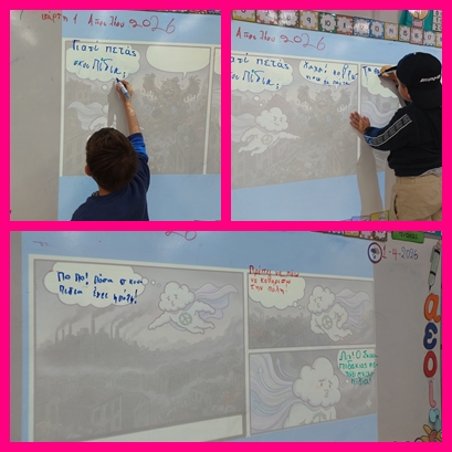 Η πρώτη μας ιστορία, η ιστορία του Σούπερ Ανέμου ήταν γεγονός! Αν είχαμε κι άλλο χρόνο θα την δουλεύαμε εμπλουτίζοντας την περισσότερο, αλλά έπρεπε να περάσουμε στο επόμενο στάδιο ... τη δημιουργία κόμικ!(βλ. παρακάτω στην Τετάρτη!). Ευχαριστούμε θερμά την κ. Ελένη Γυρέλλη που  μας αποθανάτησε φωτογραφικά σε δράση! Είναι πάντα δίπλα μας ως πολύτιμη συνεργάτης!!!