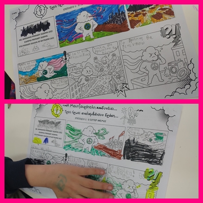 Τα παιδιά δεν πίστευαν στα μάτια τους που η ιστορία τους ζωντάνεψε με τόσο ωραίο και άμεσο τρόπο! Οι ιδέες για το τι λέει ο ήρωας μας σε κάθε σκηνή ήταν τόσες πολλές! Όλοι ήθελαν να που κάτι, ακόμα και οι πιο ντροπαλοί! Μαζί τους εκτύπωσαμε το κόμικ ασπρόμαυρο για χρωμάτισμα και συμπλήρωση των κενών. Δυστυχώς, έπρεπε να αφήσω λίγο περισσότερο χώρο για να γράψουν τα λόγια. Μας ζόρισε, αλλά το έμαθα για την επόμενη φορά! Το κόμικ συμπληρώθηκε τόσο στην ώρα της Μελέτης όσο και στην ώρα των Αγγλικών, μαζί με την κ. Ελένη μας!