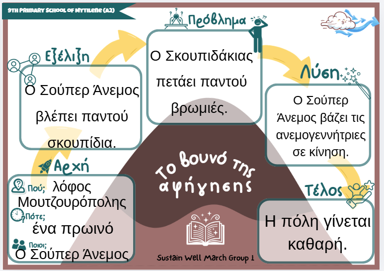 Η διδασκαλία της Γλώσσας μας, όμως, συνάντησε το eTwinning και αυτό που ακολούθησε ήταν και για μένα ένα νέο μονοπάτι διδασκαλίας στα πρωτακια, εξαιρετικά ενδιαφέρον! Στόχος μας ήταν να φτιάξουμε μια συνεργατική ιστορία με ήρωες των ανανεώσιμων πηγών ενέργειας μαζί με τα συνεργαζόμενα σχολεία μας από Κύπρο (Δ.Σ. Καμπιάς) και Ναύπλιο (Δ.Σ. Αγ. Ανδιανού).