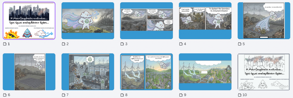 Η συνέχεια μας ήταν συναρπαστική! Χρησιμοποιώντας τις βασικές προτάσεις της ιστορίας που δημιουργήσαμε για τον Σούπερ Άνεμο την Δευτέρα ζήτησα  από την Τεχνητή νοημοσύνη να μας εικονογραφήσει την ιστορία με μορφή κόμικ, ώστε τα παιδιά να συμπληρώσουν τα λόγια στα συννεφάκια διαλόγου και σκέψης. Το αποτέλεσμα που πήρα πίσω ήταν εκπληκτικό!