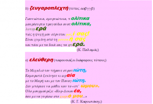 2. «Η αλλαγή αυτή είτανε βέβαια σιγανή κι απ' έξω μοναχά. Το φυσικό της δεν μπορούσε να τ' αλλάξ' η χωριατοπούλα.» .