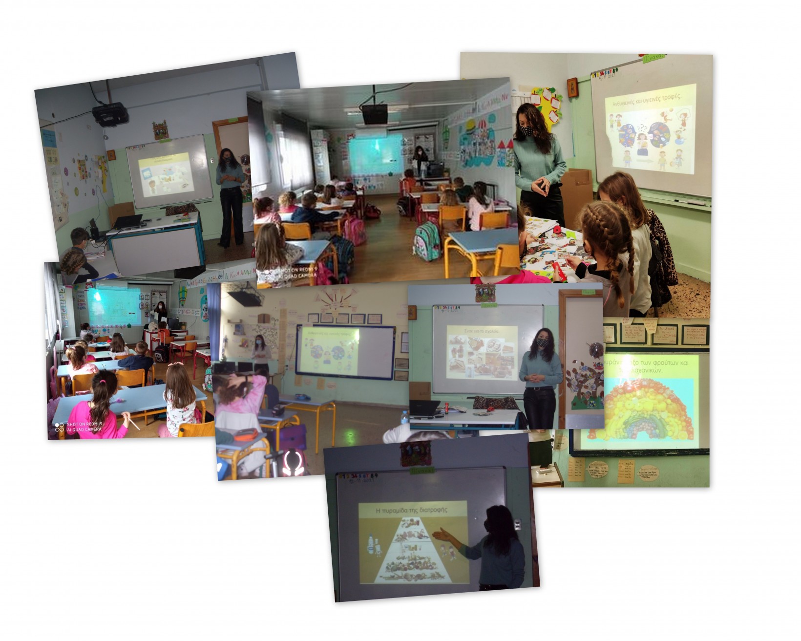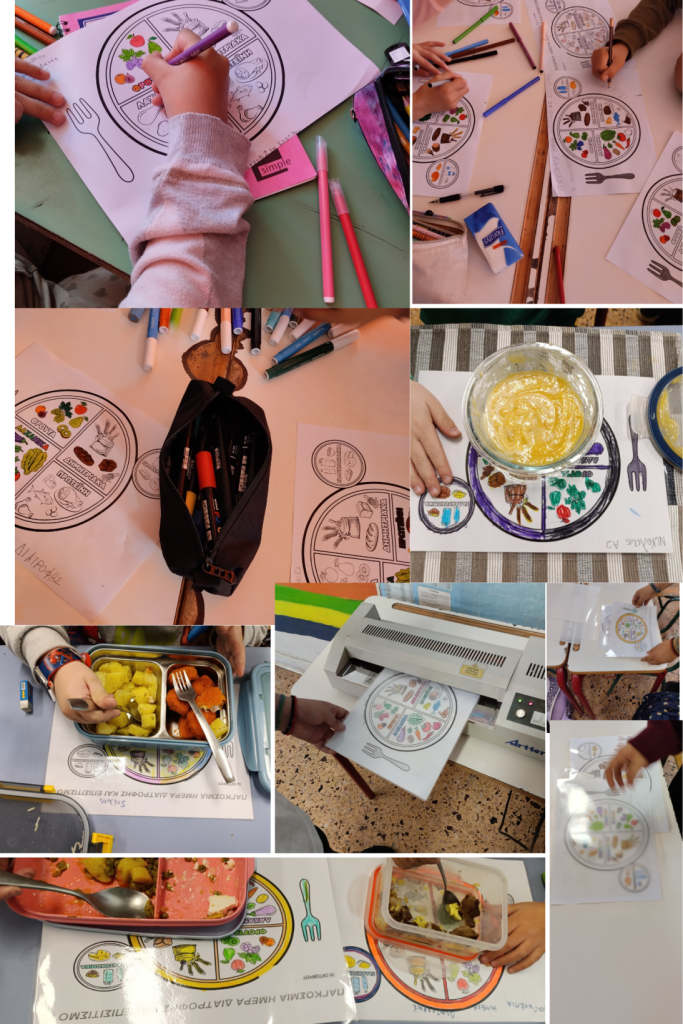 ενημερωτικές επισκέψεις σε μαθητές/τριες τάξεων του σχολείου μας και δημιουργήθηκαν ειδικοί ενημερωτικοί πίνακες με προτάσεις για:το πρωινό,το κολατσιό,τα βασικά γεύματα των παιδιών, οι οποίες μπορούν να εφαρμοστούν τόσο στο πλαίσιο του ολοήμερου σχολείου (ώρα διατροφής) όσο και γενικότερα στην καθημερινή τους ζωή.