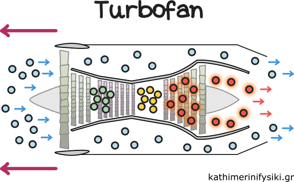 Ένα επιβατικό αεροπλάνο συνήθως διαθέτει κινητήρες τζετ. Υπάρχουν διάφορων ειδών τέτοιοι κινητήρες αλλά όλοι πάνω-κάτω λειτουργούν με παρόμοιο τρόπο. Αρχικά ο περιβάλλων αέρας εισέρχεται στη μηχανή, συνήθως μέσω ενός τεράστιου ανεμιστήρα. Κάποιο κομμάτι του μπαίνει στον πυρήνα της μηχανής όπου συμπιέζεται, αναμιγνύεται με καύσιμο και αναφλέγεται. Τέλος, τα καυσαέρια εξέρχονται από πίσω με μεγάλη ορμή ωθώντας το αεροπλάνο προς την αντίθετη κατεύθυνση. Ο τρίτος νόμος του Νεύτωνα κάνει πάλι την εμφάνισή του. Το αεροπλάνο σπρώχνει τον αέρα προς τα πίσω, ο αέρας σπρώχνει το αεροπλάνο μπροστά.