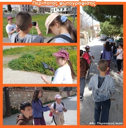 Ετσι, με πολύ μεγάλη χαρά οι μαθητές/τριες της Αγ. Παρασκευής χωριστήκαμε σε ομάδες ΙστορικώνΑρχιτεκτόνων και Φυσιολατρών και σημειώσαμε πάνω στον χάρτη μας τα σημεία που θέλουμε να φωτογραφίσουμε, αφήνοντας ανοιχτό το ενδεχόμενο να προσθέσουμε και άλλα που θα συναντήσουμε στην πορεία.   Πήραμε τα τάμπλετ του σχολείου ανα χείρας, όποιος μπόρεσε έφερε και φωτογραφική μηχανή από το σπίτι και με την κ. Ελπινίκη (οδηγός-ξεναγός-συντονίστρια), την κ. Μαρία (φωτογράφος-συντονιστρια) και την μαμά Ειρήνη (συνοδός και πολύτιμη μόνιμη κάτοικο της περιοχής-αντιπρόσωπος γονέων) ξεκινήσαμε  έναν δίωρο περίπατο στο χωριό.