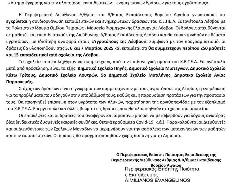 Την Τετάρτη 5 Μαρτίου 2025 η τάξη μας σε συνεργασία με την Βλ και την Στ τάξη του σχολείου μας επισκεφθηκε τους υδροβιότοπους στις αλυκές Καλλονής. Το έγγραφο εγκρισης της εκδρομής μας από τους αρμόδιους φορείς ΚΕΠΕΑ Ευεργετούλα και Μουσείο Ελαιουργείας.