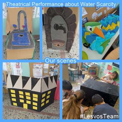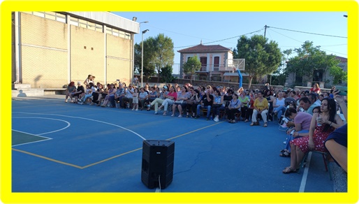 Τα σκηνικά βρήκαν στην αυλή ετοιμα για να πλαισιώσουν το χώρο της σκηνής! Δυστυχώς λόγω του υπερβολικού αέρα το γιγάντιο σκηνικό μας δεν τα κατάφερε και δεν έμεινε όρθιο για την παράσταση. Εμείς όμως δεν πτοηθήκαμε και συνεχίσαμε όπως είχαμε μάθει και στις πρόβες.
