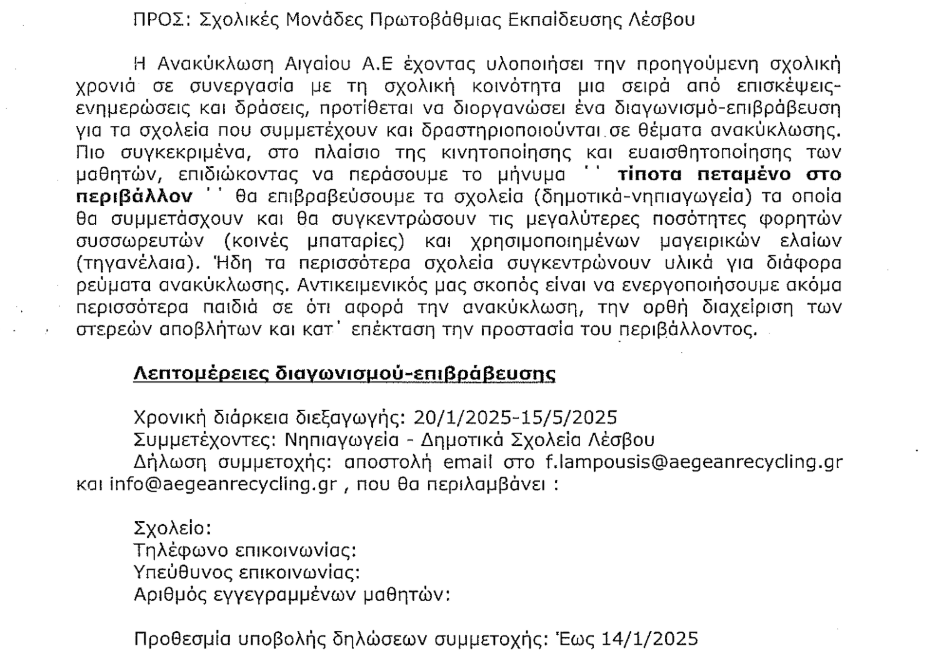 Αυτήν την εβδομάδα αδράξαμε μια μεγάλη ευκαιρία να συμβάλλουμε ενεργά στην προστασία του περιβάλλοντος. Στις 9/1/2025 ένα email   έφτασε στο σχολείο που μας παρακινούσε να πάρουμε μέρος σε ένα Διαγωνισμό ανακύκλωσης μεταξύ όλων των σχολείων του νησιού μας. Υπέυθυνη εταιρία είναι η "Ανακύκλωση Αιγαίου ΑΕ".