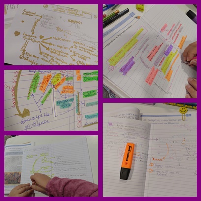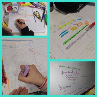 Επιπλέον, ξεκινήσαμε μια νέα προσέγγιση στο μάθημα της Ιστορίας: αν και θα ανεβαίνει η παρουσίαση του μαθήματος, οι ερωτήσεις και κουίζ εξάσκησης κανονικά, αποφασίσαμε να μάθουμε να κάνουμε σχεδιαγράμματα για το κείμενο που έχουμε να μελετήσουμε κάθε φορά. Το σχεδιάγραμμα θέλη τρόπο, χρώματα και ...αρώματα (όπως λέει η κ. Μαρία) και το σχεδιάζουμε όλοι μαζί στον διαδραστικό πίνακα. Έτσι, τα τετράδια της ιστορίας μας γέμισαν βελάκια και λέξεις κλειδιά!
