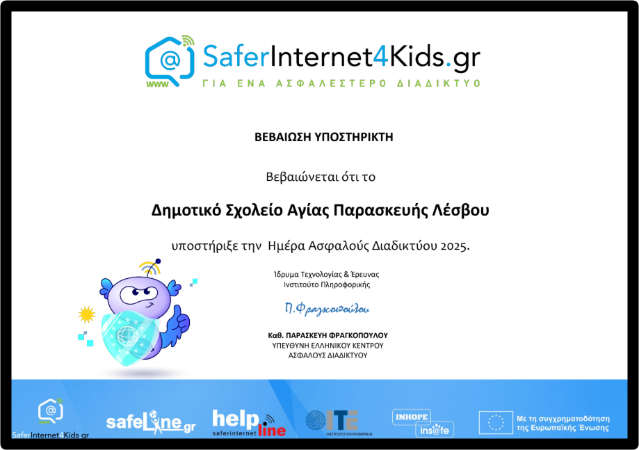 Επίσης, παραλάβαμε τα πιστοποιητικά μας ως επίσημοι υποστηρικτές ασφαλούς διαδικτύου 2025!