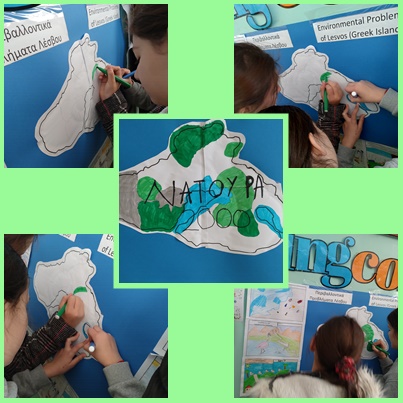 Με αποσπασματικές αναγνώσεις και ενδιάμεσες συζητήσεις ξετυλίξαμε ερωτήσεις, απορίες, αγνωστες έννοιες και προβληματιστήκαμε γύρω από την κλιματική αλλαγή και την ανάγκη να κάνουμε όλοι κάτι για αυτό. Στη συνέχεια, αναζητήσαμε πιο συγκεκριμένα τις περιοχές Natura 2000 της Λέσβου, του νησιού μας. Τις εντοπίσαμε στο χάρτη μέσα από της πληροφορίες του ΚΠΕ Καλλονής και τις χρωματισαμε και στον δικό μας χάρτη.