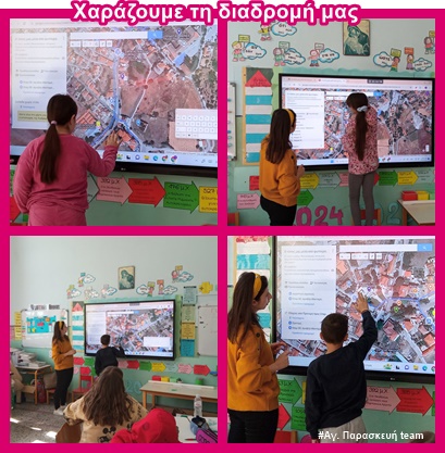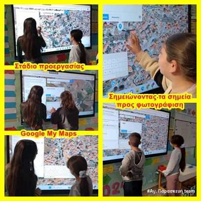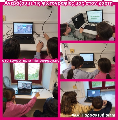 Στο επόμενο στάδιο, μέσα στο εργαστήρι Πληροφορικής,  ανεβάσαμε όλες τις φωτογραφίες στα σημεία που είχαμε βάλει στον χάρτη μας, και προσθέσαμε τίτλους και περιγραφή. Στο τέλος, μέσα από το εργαστήριο δραστηριοτήτων, χαράξαμε με τη βοήθεια του διαδραστικού χάρτη τη διαδρομή που ακολουθήσαμε και αναστοχαστήκαμε όσα συναντήσαμε και τι εντυπώσεις μας άφησε η εμπειρία αυτή!
