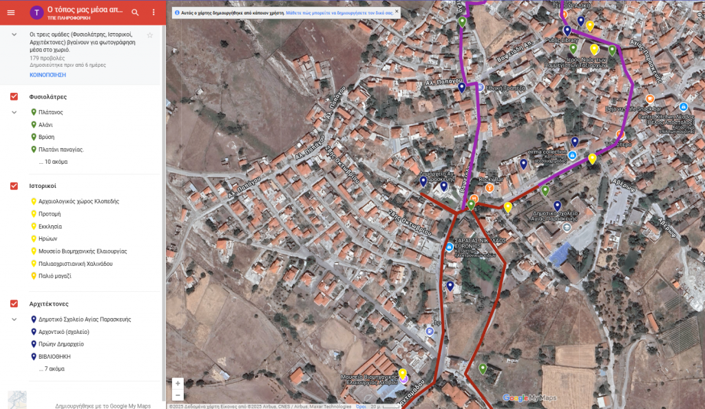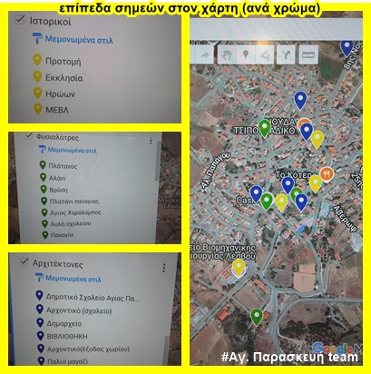 Πριν βγούμε βόλτα στο χωριό για να φωτογραφίσουμε έπρεπε πρώτα να τα ορίσουμε διαφορα σημείαστον διαδραστικό χάρτη, ώστε να προετοιμάσουμε τη διαδρομή μας. Αφού τα εντοπίσαμε τα ομαδοποιήσαμε σε τρεις κατηγορίες, στα ιστορικά μνημεία, στα σημεία αρχιτεκτονικού ενδιαφέροντος και στα σημεία φυσικού ενδιαφέροντος.