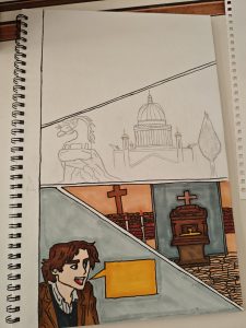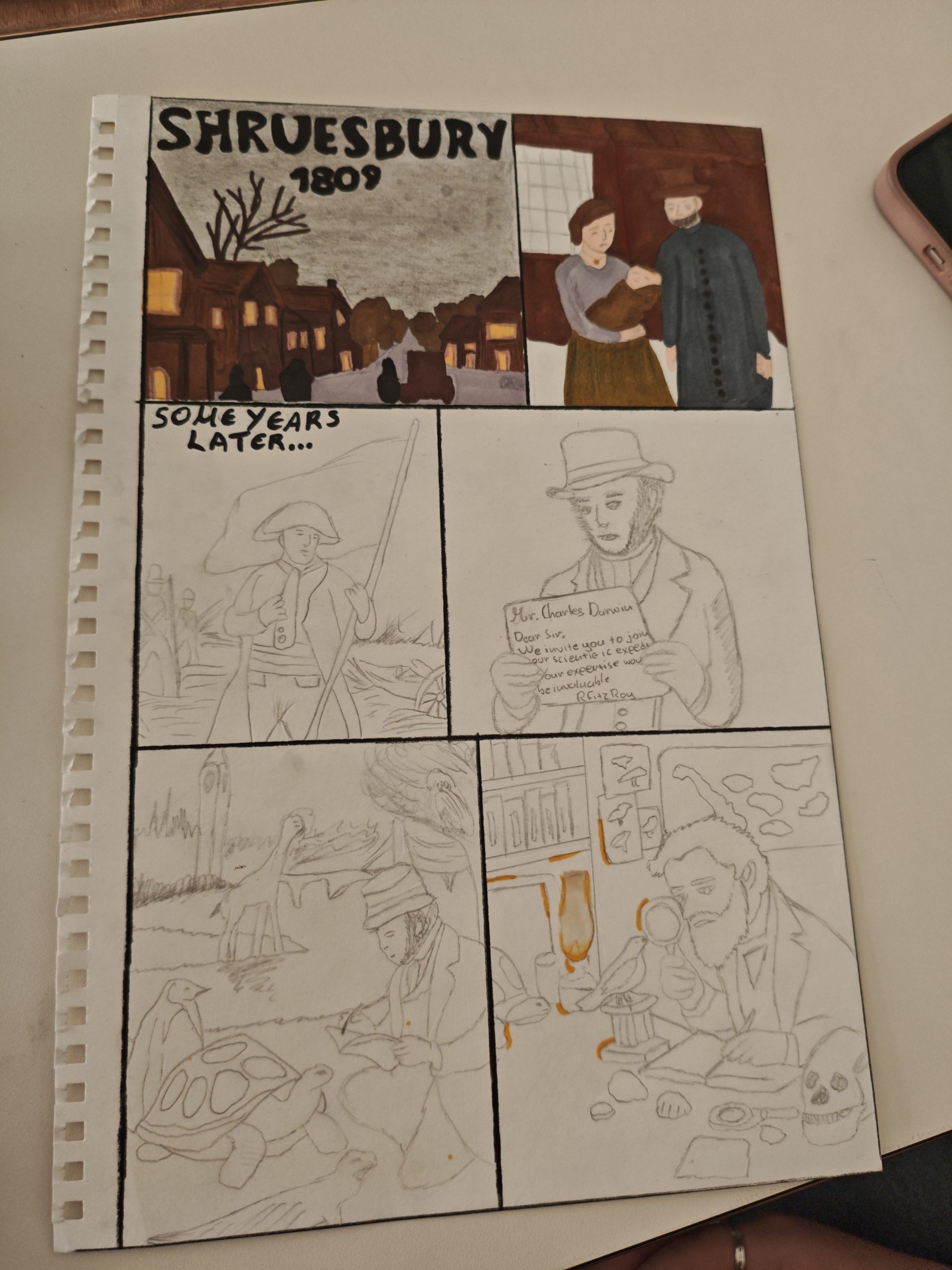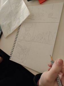 Οι εικόνες που ακολουθούν δεν είναι απλώς σκίτσα. Είναι οι πρώτες στιγμές όπου η επιστήμη άρχισε να μεταμορφώνεται σε αφήγηση, σε χαρακτήρες, σε καρέ. Με μολύβι, χρώμα και φαντασία, οι μαθητές και οι μαθήτριες του Graphic Novel Lab έκαναν το πρώτο τους βήμα από την ιστορική πληροφορία στη δημιουργική έκφραση, δοκιμάζοντας πώς μια επιστημονική ιδέα μπορεί να «μιλήσει» μέσα από εικόνες.