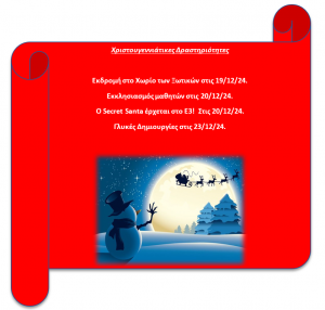 Την Παρασκευή 20-12-2024 θα πραγματοποιηθεί εκκλησισμός των μαθητών.
