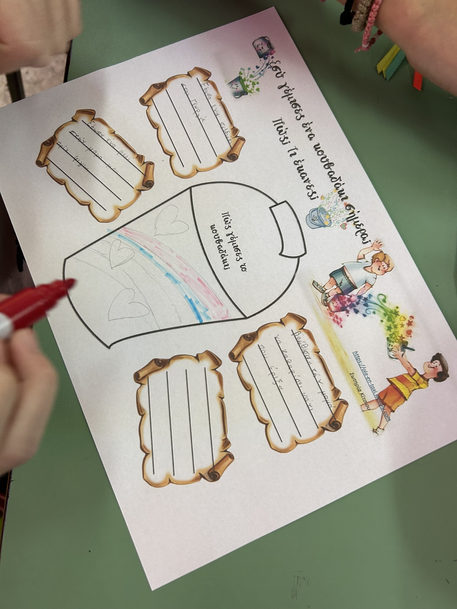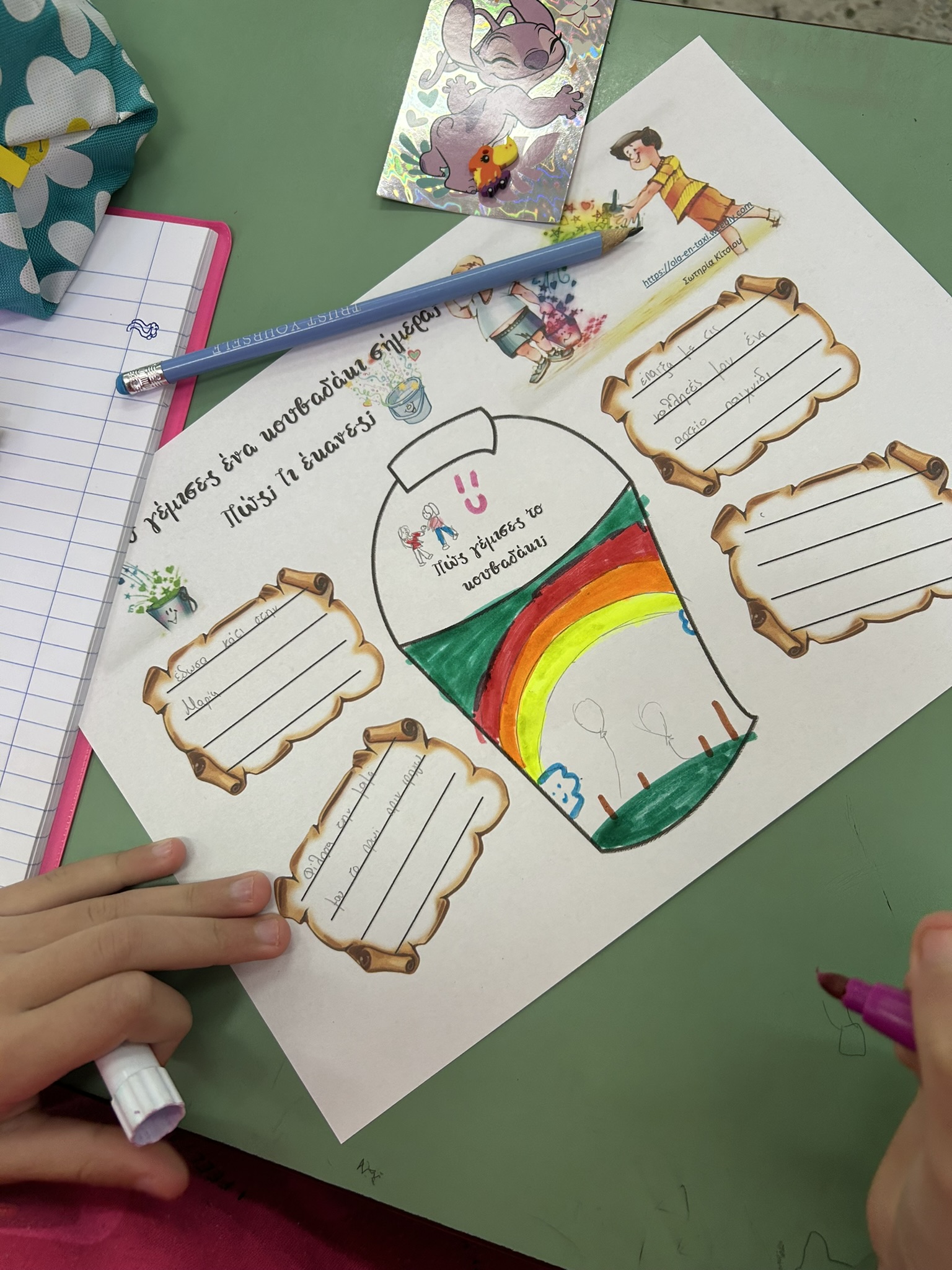 Ακούσαμε ένα απόσπασμα απο το παραμύθι “Εσύ Γέμισες Ένα Κουβαδάκι Σήμερα;”. Έπειτα συζητήσαμε για το αόρατο κουβαδάκι που κουβάλαμε όλοι μας . Συμπληρώσαμε το φύλλο εργασίας για τα δικά μας κουβαδάκια.Τέλος στη τάξη μας θα έχουμε όλοι τα δικά μας κουβαδάκια. Στόχος μας θα είναι να μην αδειάσουν τα κουβαδάκια μας απο τα όμορφα συναισθήματα όπως ΑΓΑΠΗ, ΕΥΓΕΝΕΙΑ, ΣΕΒΑΣΜΟ και ΧΑΜΟΓΕΛΟ!!!