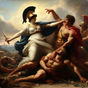 Ο θυμός του Αχιλλέα Θύμωσε ο Αχιλλέας για την προσβολή, κι αν δεν κατέβαινε αόρατη η Αθηνά να τον συγκρατήσει, θα χτυπούσε τον Αγαμέμνονα με το σπαθί του. Υπάκουσε ο Αχιλλέας στην Αθηνά κι έδωσε τη Βρισηίδα. Θύμωσε όμως κι αποτραβήχτηκε στα πλοία του, μαζί με το φίλο του τον Πάτροκλο, και δεν πολεμούσε. |