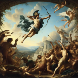 Απόλλωνας Έφυγε ο Χρύσης κι όπως περπατούσε στην ακρογιαλιά, καταράστηκε τους Έλληνες και παρακάλεσε τον Απόλλωνα να τους τιμωρήσει. Ο θεός τον άκουσε και κατέβηκε θυμωμένος σ’ ένα βουνό κοντά στην Τροία και άρχισε να σκοτώνει με τις σαΐτες του πρώτα τα μουλάρια και τα σκυλιά των Ελλήνων. Και σαν είδε πώς ο Αγαμέμνονας δεν άλλαζε γνώμη, άρχισε να σκοτώνει και τους ανθρώπους. |