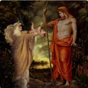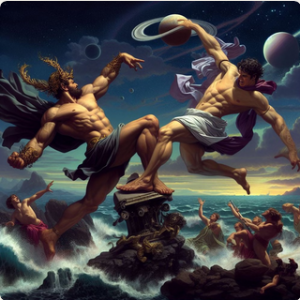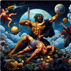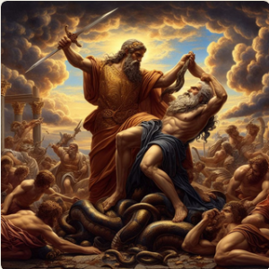 Ο τολμηρός Τιτάνας Κρόνος χτύπησε τον Ουρανό με το δρεπάνι του και τον πλήγωσε. Από την πληγή του χύθηκε πολύ αίμα και ο Ουρανός έχασε τη δύναμή του. Έτσι έγινε θεός και κυβερνήτης του κόσμου ο Κρόνος. "Το ίδιο θα πάθεις κι εσύ από το παιδί σου", είπε στον Κρόνο ο Ουρανός και ανέβηκε ψηλά και δεν ξανακατέβηκε χαμηλά στη Γη. |