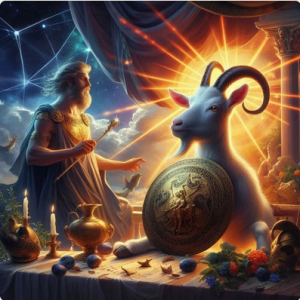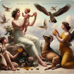 Η ανατροφή του Δία Τον Δία τον μεγάλωσαν γρήγορα οι Νύμφες. Μια κατσίκα, η Αμάλθεια, του έδινε το γάλα της, οι μέλισσες του έφερναν μέλι, τα περιστέρια του έφερναν από την άκρη του κόσμου την αμβροσία κι ένας αετός του έφερνε το νέκταρ. Έτσι ο Δίας έγινε πολύ δυνατός. |