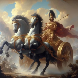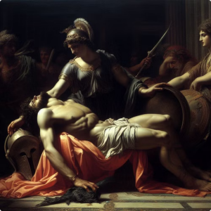 Ο φοβερός Αχιλλέας έδεσε τότε από τα πόδια τον Έκτορα στο άρμα του και σέρνοντάς τον τον έφερε και τον έριξε πλάι στον νεκρό φίλο του. — Είσαι τώρα ευχαριστημένος, Πάτροκλε; έλεγε κι έκλαιγε πικρά. |