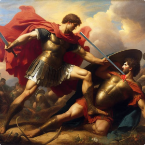 Μονομαχία Αχιλλέα - Έκτορα Από τα τείχη έβλεπαν οι Τρώες. Τον έπιασε τέλος το φιλότιμο και η ντροπή και σταμάτησε να πολεμήσει τον Αχιλλέα. Η μονομαχία ήταν άγρια κι ο Έκτορας χτυπούσε σαν παλικάρι. Όμως ο Αχιλλέας με μια γερή κονταριά τρύπησε το λαιμό του και το γενναίο παλικάρι της Τροίας έπεσε νεκρό. |