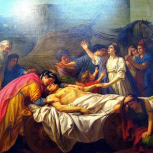 Θρήνος Ψηλά στα τείχη θρηνούσε η Εκάβη κι ο Πρίαμος και πιο πολύ η γυναίκα του, η σεμνή Ανδρομάχη. Έκλαιγε κι ο λαός των Τρώων. Τι θα απογίνει η Τροία χωρίς τον Έκτορα, έλεγαν.