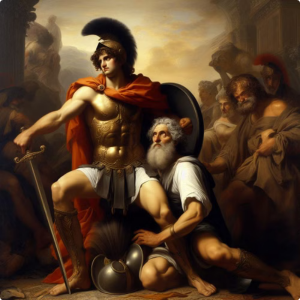 Η ικεσία του Πρίαμου Μια από τις επόμενες μέρες ήρθε στη σκηνή του Αχιλλέα ο γερο-Πρίαμος, με πλούσια δώρα. Έπεσε στα πόδια του ήρωα και τον παρακάλεσε να του δώσει το σώμα του γιου του, για να το θάψει. — Θυμήσου, Αχιλλέα, πως έχεις κι εσύ πατέρα γέροντα, που σε περιμένει να γυρίσεις πίσω, και σεβάσου τον πόνο μου, έλεγε και κλαίγοντας φιλούσε τα χέρια, που σκότωσαν τον Έκτορα. |