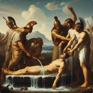 Τα νέα όπλα του Αχιλλέα Βγήκε η Θέτιδα μέσα από τα κύματα και τότε εκείνος την παρακάλεσε να πάει στον θεό Ήφαιστο, να του φτιάξει μια καινούργια πανοπλία. Πέταξε η θεά στον Όλυμπο και πριν καλά βραδιάσει, του έφερε μια πανοπλία, που όμοια δεν υπήρχε. Επάνω στην ασπίδα του είχε σχεδιάσει ο θείος τεχνίτης ό,τι υπάρχει επάνω στη γη και στον ουρανό. |
