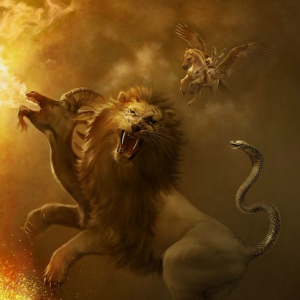 Η Χίμαιρα ήταν ένα μυθικό θηρίο, απόγονος του τρομερού Τυφώνα και της φοβερής Έχιδνας. Ζούσε σε μια απόκρημνη χαράδρα και παραμόνευε κρυμμένη μέχρι να πλησιάσει κάποιος περαστικός, για να τον κάψει ολοσχερώς με τη φλόγα της. Είχε τρία κεφάλια: ένα κεφάλι λιονταριού μπροστά, ένα κεφάλι φιδιού πίσω και, στη μέση, ένα κεφάλι κατσίκας που έβγαζε φλόγες. Ήταν γρήγορη και φαινόταν ανίκητη εξαιτίας της ακατάσχετης φωτιάς που ξερνούσε. |