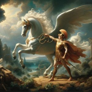 | Βελλερεφόντης - Πήγασος Όταν ξύπνησε, βρήκε το χρυσό χαλινάρι δίπλα του και ακολούθησε τις οδηγίες που είδε στο όνειρό του. Κατάφερε να αιχμαλωτίσει και να ιππεύσει τον Πήγασο. Έτσι, γεμάτος θάρρος, ξεκίνησε το ταξίδι του για να αντιμετωπίσει το φοβερό τέρας, τη Χίμαιρα.