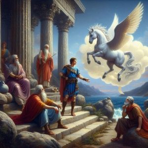 Πριν ξεκινήσει την αποστολή του, ο Βελλεροφόντης συνάντησε τον σοφό μάντη Πολύειδο, ο οποίος του έδωσε πολύτιμες συμβουλές. Του αποκάλυψε πως για να νικήσει τη Χίμαιρα έπρεπε να πιάσει το φτερωτό άλογο, τον Πήγασο. Για να το πετύχει αυτό, έπρεπε να κοιμηθεί στο ναό της θεάς Αθηνάς. |