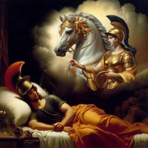 Ο Βελλεροφόντης υπάκουσε και, πράγματι, στο όνειρό του, η θεά του πρόσφερε ένα χρυσό χαλινάρι. Το χαλινάρι έπρεπε να φορεθεί στον Πήγασο την ώρα που έπινε νερό από την πηγή της Ειρήνης, στην ακρόπολη της Κορίνθου.