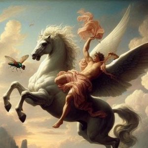 Ο Δίας, θυμωμένος για την υπερηφάνεια του Βελλεροφόντη, έστειλε μια αλογόμυγα να τσιμπήσει τον Πήγασο, ο οποίος τον έριξε στη γη. Έτσι, ο Βελλεροφόντης έμεινε τυφλός και περιπλανήθηκε στη γη μέχρι το τέλος των ημερών του, θυμίζοντας σε όλους ότι η υπερηφάνεια μπορεί να φέρει την πτώση ακόμα και στους πιο γενναίους ήρωες. |