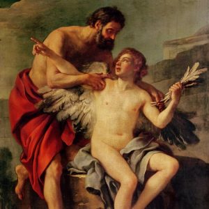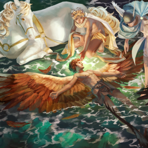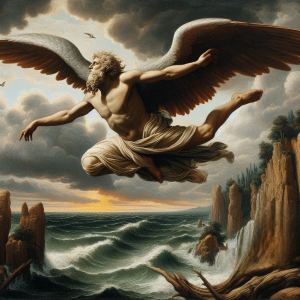 Ο Δαίδαλος, ανήμπορος να τον σώσει, είδε τον αγαπημένο του γιο να πέφτει και να εξαφανίζεται στα κύματα. |