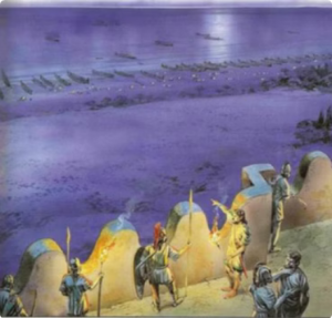 Οι Τρώες βλέπουν την έρημη ακτή Έβλεπαν κι οι Τρώες ψηλά από τα τείχη και δεν πίστευαν τα μάτια τους. Δέκα χρόνια συνήθισαν να βλέπουν τους Έλληνες στην ακρογιαλιά, και τώρα ο τόπος ήταν έρημος. Βγήκαν οι πιο τολμηροί έξω, πήγαν ως τη θάλασσα, κοιτάνε από δω, κοιτάνε από κει. Ψυχή δεν έβλεπαν. Γυρίζουν τρέχοντας στην πόλη και φέρνουν τα νέα στους άλλους. Τότε όλοι οι Τρώες κατέβηκαν στην ακρογιαλιά, ελεύθεροι πια από το φόβο. Το μόνο που έβλεπαν στο έρημο ακρογιάλι ήταν ένα γιγάντιο Δούρειο ίππο. |