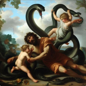 Ο θάνατος του Λαοκόοντα Εκείνη τη στιγμή, όμως, έγινε κάτι παράξενο. Άρχισαν να βγαίνουν σφυρίζοντας δύο τεράστια φίδια, που προχωρούσαν χωρίς να πειράζουν κανένα. Μόνο όταν έφτασαν κοντά στον Λαοκόοντα και τα δύο παιδιά του, χύμηξαν μανιασμένα, τους τύλιξαν και τους έπνιξαν.